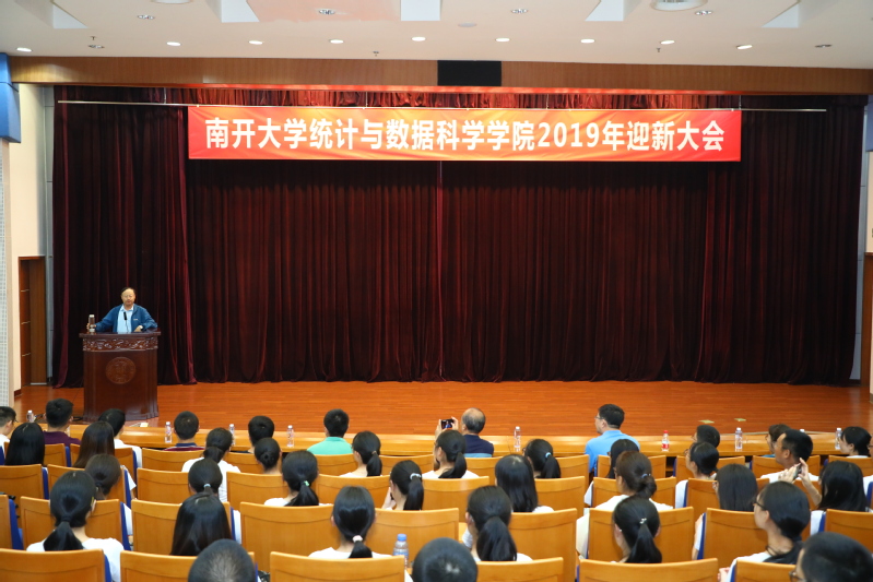在全体师生齐唱《中华人民共和国国歌》后,马志明院长代表全体教师向2019级新生的到来表示热烈的欢迎和诚挚的祝贺。面对济济一堂的2019级新生,马志明说,大数据是社会的需要,时代的召唤,统计与数据科学既是世界科学的前沿,也是实际生活的需要,同学们赶上了最好的时代,也必将在这一领域大有所为。所谓“生逢其时,重任在肩”,南开统计人肩上承担的不仅是学院领导老师的期许,更是国家和社会的厚望。马志明希望同学们好好学习专业知识,认真开展科学研究,学校和社会期待着大家,在不久的将来能够为我们的国家做出巨大的贡献。