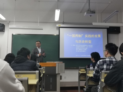 李晓兵教授以两个问题作为整场讲座的开场“香港、珠江口、澳门的相对位置是什么样子?”“文天祥的《过零丁洋》中,最重要的一句诗是哪句?”简单的问答互动,一下子便调动起了同学们的积极性,更引出了讲座的主题。接着,他从台湾、香港、澳门的地理位置出发,结合历史背景、文化因素等多个角度,介绍了“一国两制”政策的由来和发展。他讲到,“一国两制”政策最早以解决台湾问题为主要目的,是我国为应对全球化浪潮的一次探索与创造性的伟大实践。几十年来,“一国两制”政策用实践成果证明了它的可行性,而港澳特区的经济繁荣和台湾的渐显乏力相对比,更印证了民族团结的重要性和必然性。