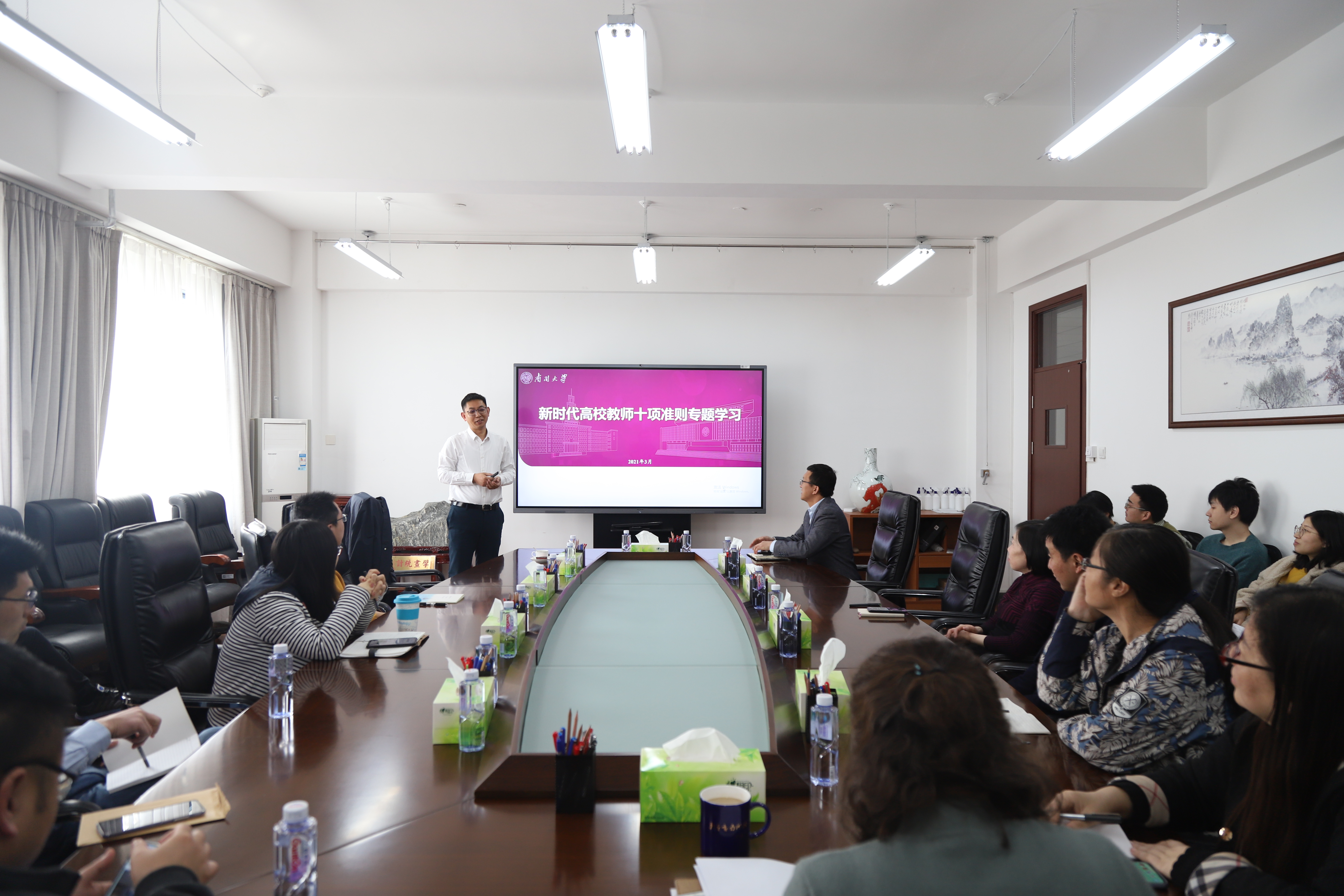 杜雨津首先从准则制定的背景切入,进而对准则的十项要求包括坚定政治方向、自觉爱国守法、传播优秀文化、潜心教书育人、关心爱护学生、坚持言行雅正、遵守学术规范、秉持公平诚信、坚守廉洁自律、积极奉献社会逐条进行细致深入的讲解。第二部分通过列举师德失范案例进行警示教育,引导教师恪守教师职业行为底线。最后杜雨津倡导广大教师在南开做一名有理想信念、有道德情操、有扎实学识、有仁爱之心的“四有”好老师。讲解部分结束后杜雨津也与学院教师进行深入交流。