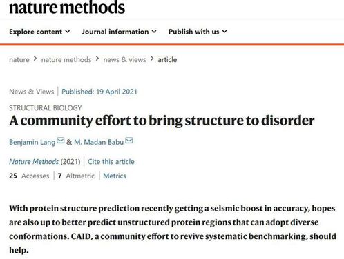 南开新闻网讯 近日,《自然-方法》杂志刊发题为“Critical assessment of protein intrinsic disorder prediction”的研究论文并配发题为“A community effort to bring structure to disorder”的新闻,报道了国际蛋白质无序区域预测比赛(CAID)的详情。我校国产自拍 教授胡刚、数学科学学院副教授王奎与美国弗吉尼亚联邦大学教授Lukasz Kurgan等合作开发的预测方法fIDPnn在此项比赛中表现优异,多项指标取得第一名。