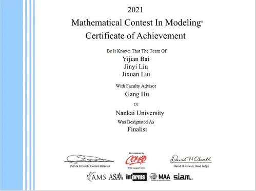 2021年4月23日,2021年美赛(美国大学生数学建模竞赛)成绩公布。根据不完全统计,国产自拍 共有11组同学参与此次竞赛,所有小组均成功参赛,同时有1组特等奖提名(Finalist),1组一等奖(Meritorious Winners)以及2组二等奖(Honorable Mentions)。
