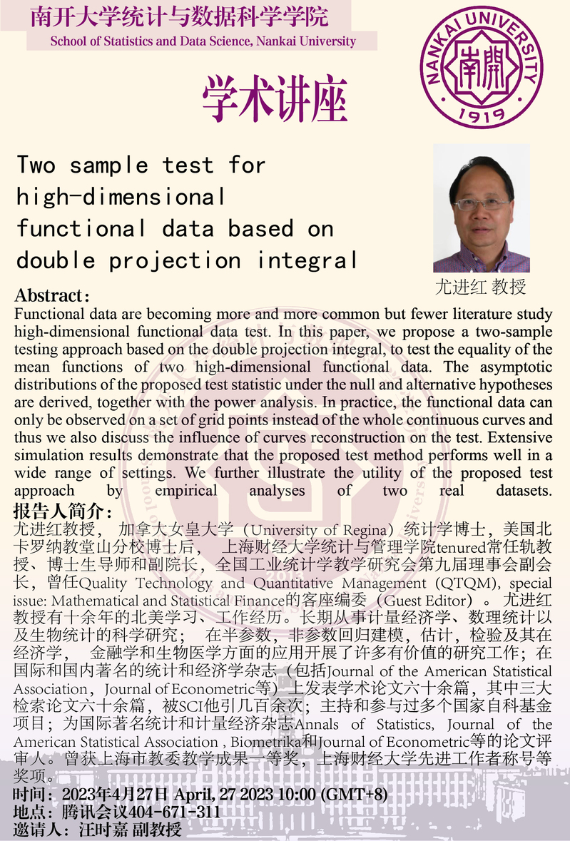 Two sample test for high-dimensional functional data based on double projection integral (尤进红)