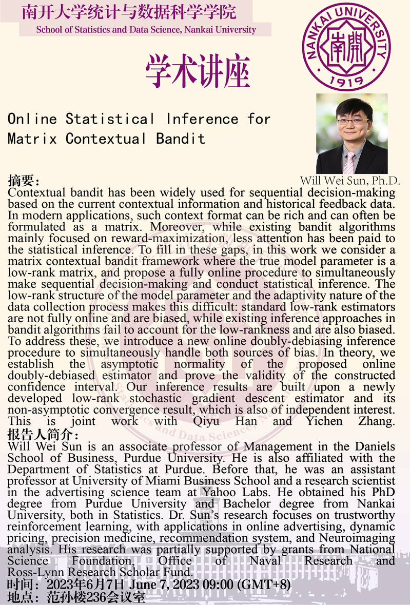 Online Statistical Inference for Matrix Contextual Bandit(孙伟)