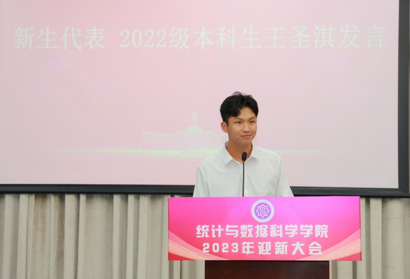 2022级本科生王圣淇作为新生代表发言,他分享了自己成长路上的奋斗历程,表示来到统院以后,同学们未来依旧要面临许多艰难险阻,要始终付出努力,才能获得成长。他认为:“求学问需要真正的爱与执着。”同学们要心怀大数据造福社会的美好愿景,也要具有“小我融入大我”的社会担当,使之化为坚持到底的勇气和力量。