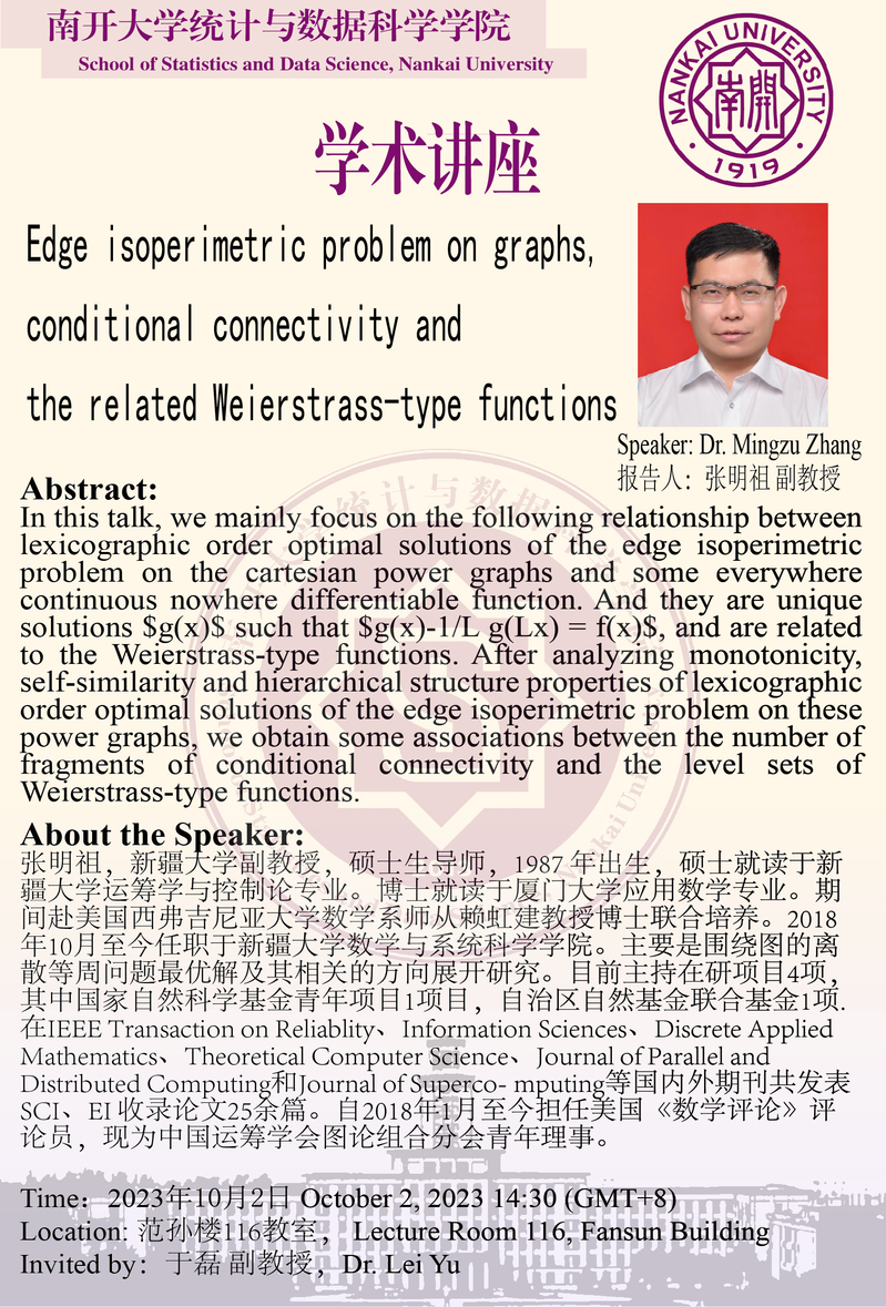Edge isoperimetric problem on graphs, conditional connectivity and the related Weierstrass-type functions(张明祖)