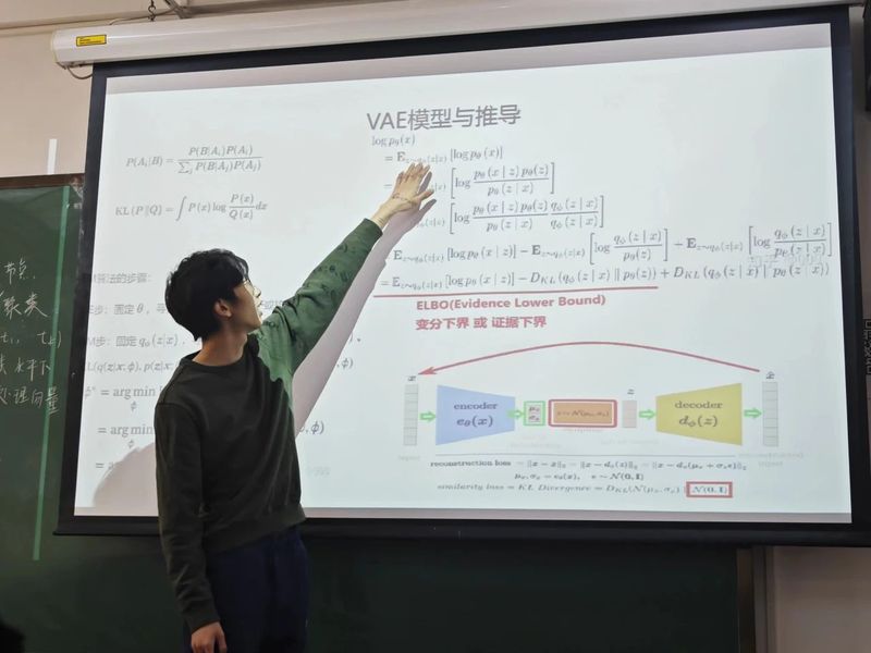 随后,他介绍了生成式模型和判别式模型的区别,并用图像形象说明了基础生成式模型的组成部分、原理、区别,并具体介绍了VAE和cave模型的推导过程,通过介绍扩散模型引入潜在扩散模型,讲解了其优点与训练模型的方法。