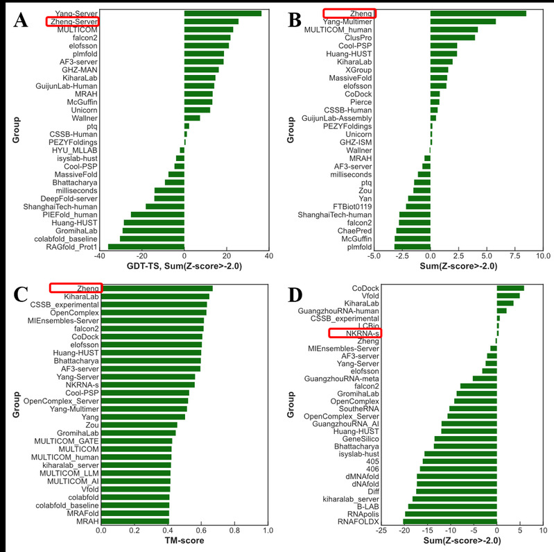 图1. CASP16多项结构预测排名。(A) 蛋白质单体单结构域预测排名(Top 30)。(B) “hard”蛋白质复合物结构预测排名(Top 30)。(C) 大分子多构象预测排名(Top 30)。(D) 核酸多聚体结构预测排名(Top 30)。红色方框为郑伟教授参赛方法。