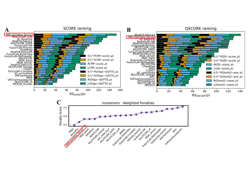 图3. CASP16 准确性估计排名。(A) 复合物整体折叠精度估计(SCORE)排名。(B) 复合物整体界面精度估计(QSCORE)排名。(C) 单体模型筛选排名。红色方框为郑伟教授参赛方法。