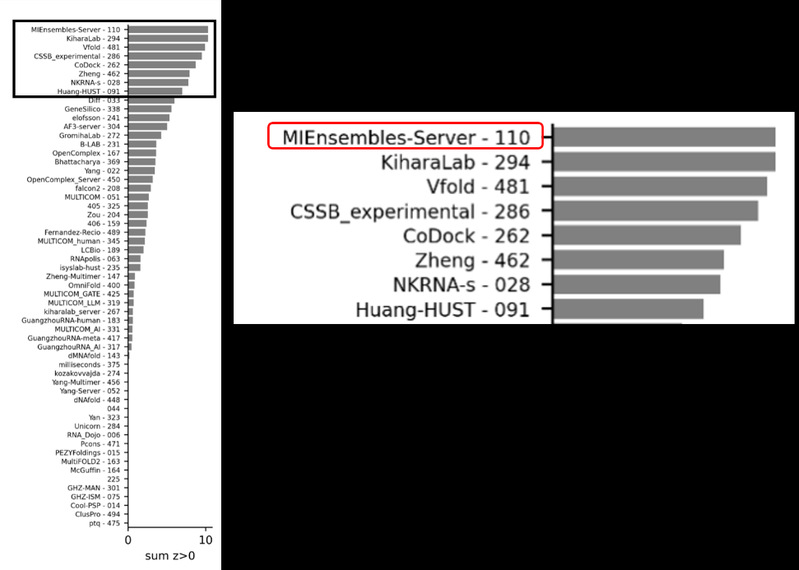 图2. CASP16蛋白质-核酸复合物结构预测排名。红色方框为郑伟教授参赛方法。