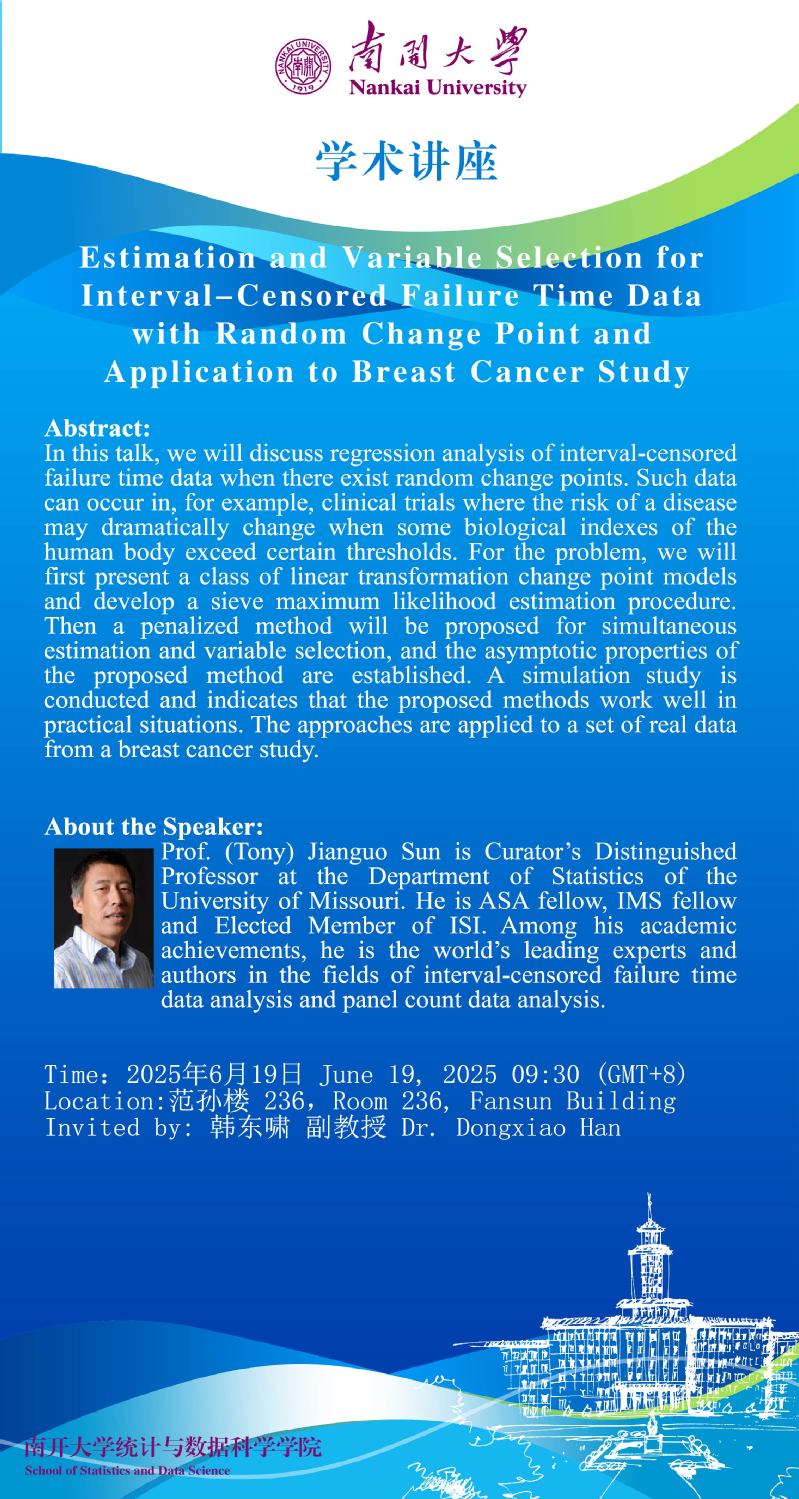 Estimation and Variable Selection for Interval-Censored Failure Time Data with Random Change Point and Application to Breast Cancer Study(Jianguo Sun)